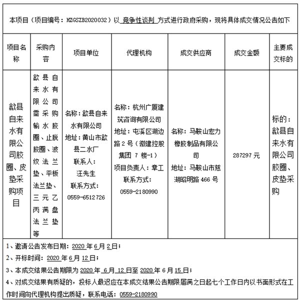 歙县自来水有限公司胶圈、皮垫采购项目成交结果公告